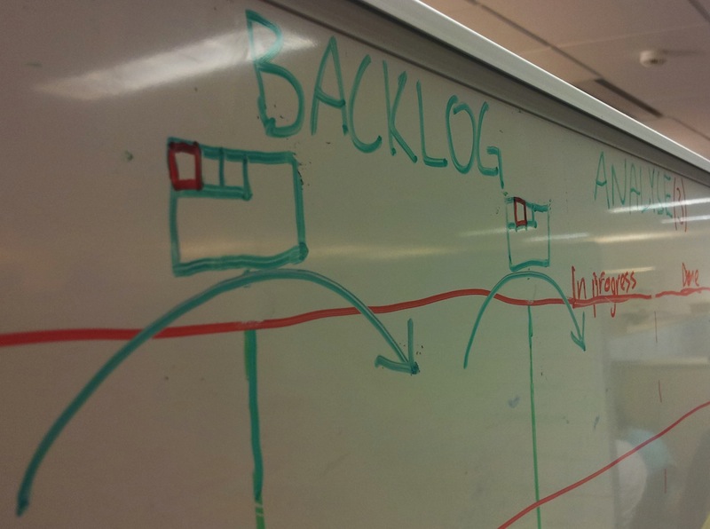 First arrow in the image above shows the transition when the ticket is prepared and moved into the backlog. The person moving the ticket fills in the current date in the upper left corner (the red square). Similar happens in the next transition from backlog to analysis.